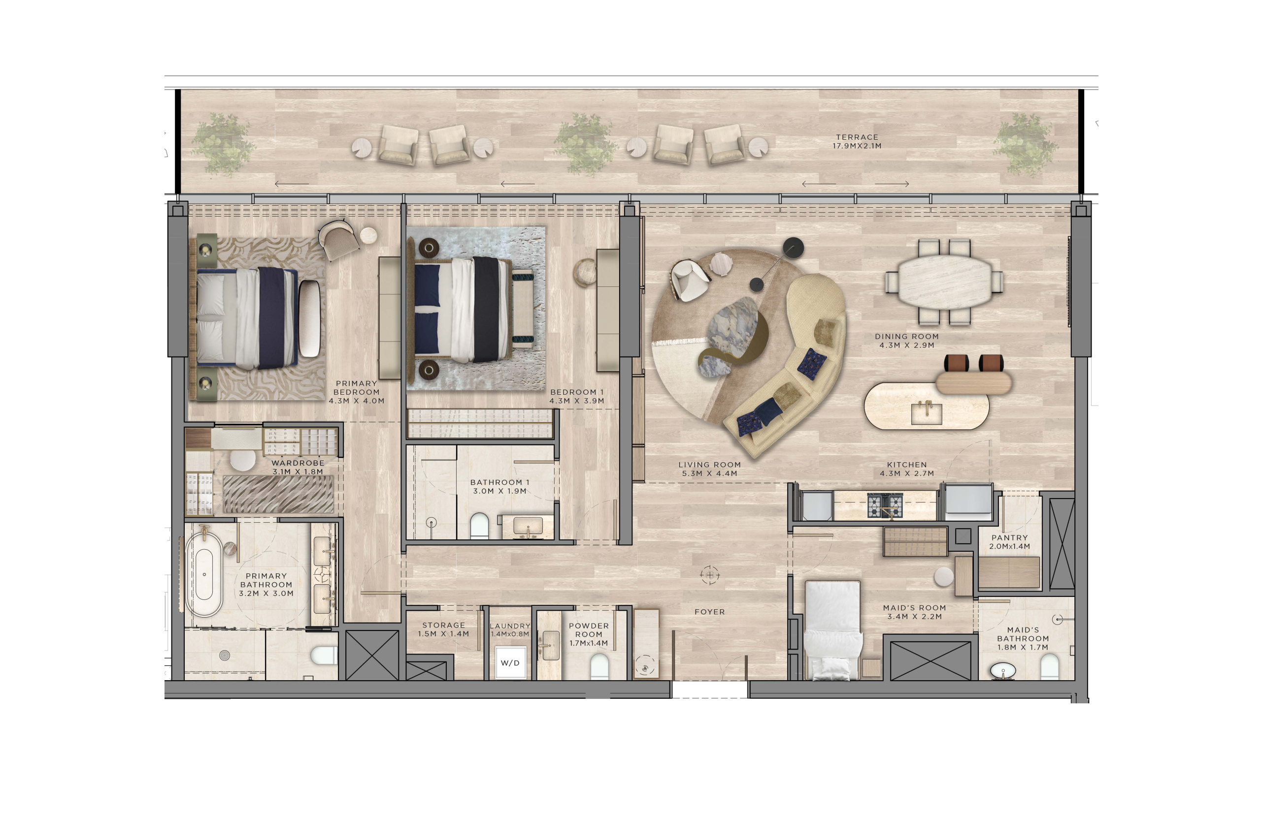 Each residence has been meticulously crafted with attention to detail, evoking a sense of artistry that reflects the surrounding cultural landmarks. Floor-to-ceiling windows flood interiors with natural light, creating a seamless connection between the indoors and the panoramic views of the Arabian Gulf and the iconic Zayed National Museum. Elegant living spaces and designer finishes create an atmosphere of understated grandeur, ideal for residents who seek both tranquillity and sophistication.